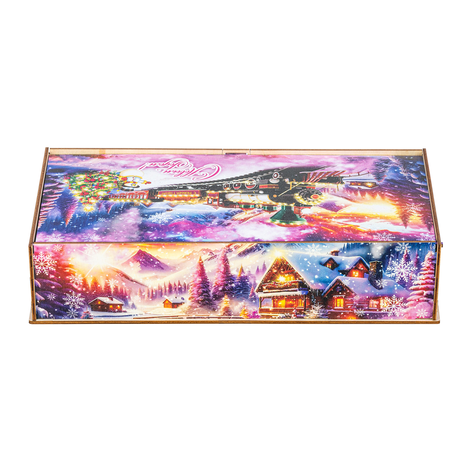 Секрет идеального новогоднего сладкого подарка прост: это яркая привлекательная упаковка и вкусные сладости внутри. “Снежный экспресс” - это подарочный набор, который как раз прекрасно подходит под эти характеристики. Это небольшая деревянная коробчка с очень необычным ярким оформлением. На ней изображен зимний вечер в небольшой деревне, рядом с которой по железной дороге весело мчится праздничный поезд. В этом поезде находятся счастливые люди, которые вот-вот смогут увидеться со своими родными и друзьями и отпраздновать с ними Новый год. В подарочный набор входит килограмм разнообразных сладостей, небольшой памятный сувенир и безграничная радость для всей семьи!